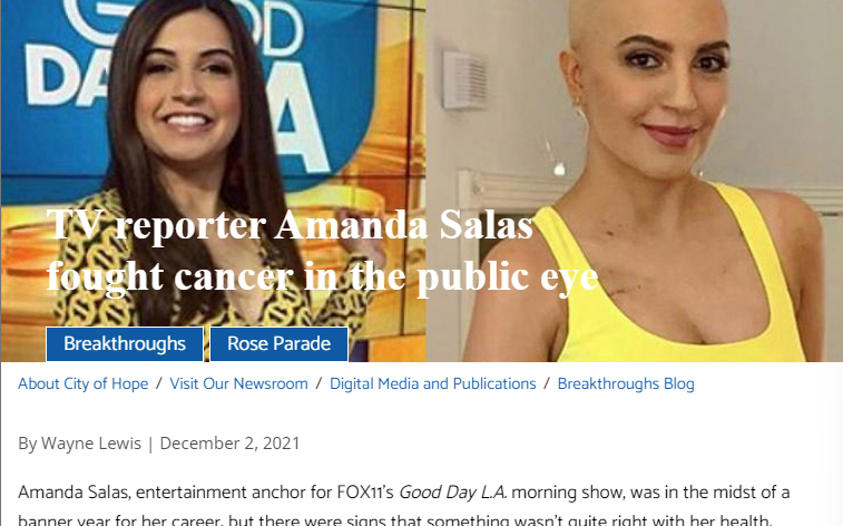 TV reporter Amanda Salas fought cancer in the public eye Click the image below to open this Q&A in a new window. first-person/q&aWayne LewisDecember 2, 2021front page Facebook0 Twitter LinkedIn0 Reddit Tumblr Pinterest0 0 Likes