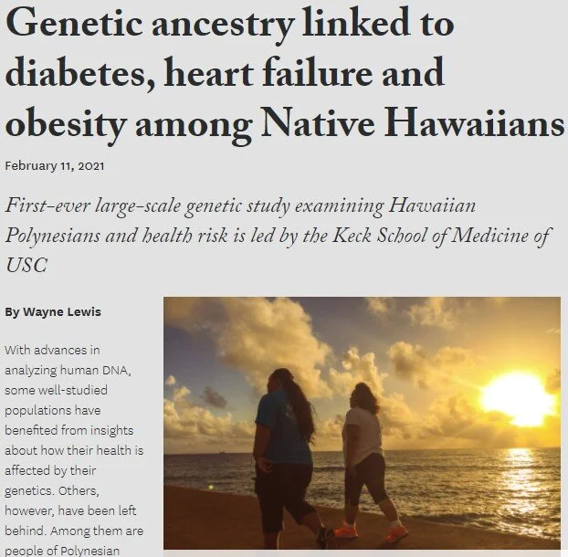 Genetic ancestry linked to diabetes, heart failure and obesity among Native Hawaiians Click the image below to open this press release in a new window. press releaseWayne LewisFebruary 11, 2021front page Facebook0 Twitter LinkedIn0 Reddit Tumblr Pinterest0 0 Likes