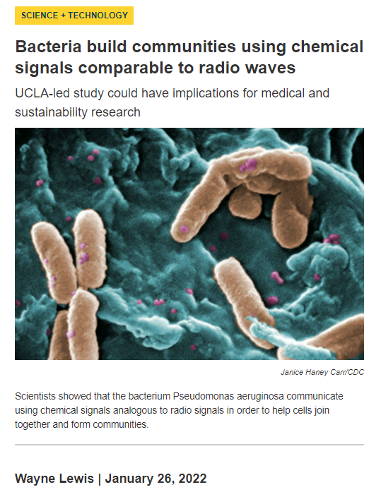 Bacteria build communities using chemical signals comparable to radio waves Click the image below to open this press release in a new window. press releaseWayne LewisJanuary 26, 2022front page Facebook0 Twitter LinkedIn0 Reddit Tumblr Pinterest0 0 Likes